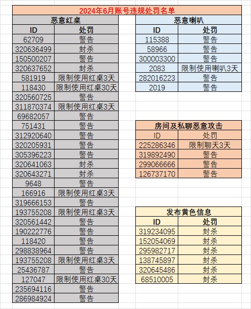 中游运营团队将定期对游戏内账号进行排查,对部分账号存在的违规行为,将进行严格处理;对多次违规的账号会不断加大惩罚力度(最高永久封禁)。