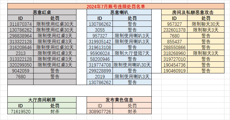 中游运营团队将定期对游戏内账号进行排查,对部分账号存在的违规行为,将进行严格处理;对多次违规的账号会不断加大惩罚力度(最高永久封禁)。