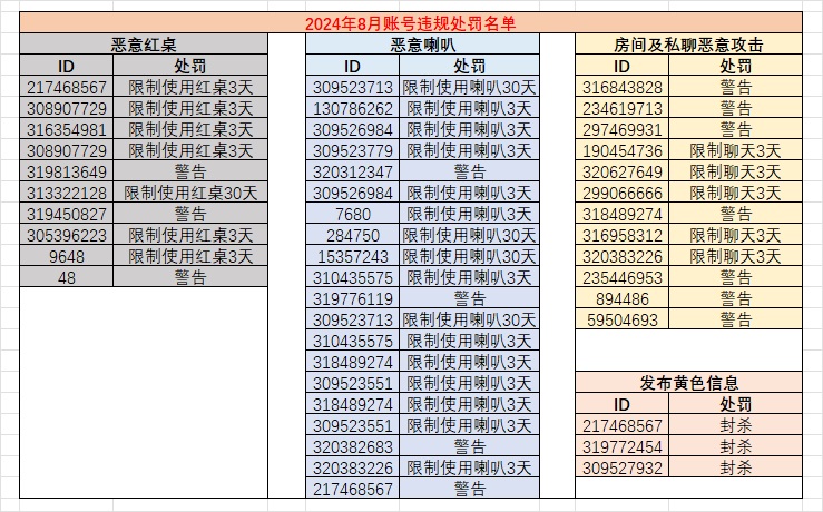 中游运营团队将定期对游戏内账号进行排查,对部分账号存在的违规行为,将进行严格处理;对多次违规的账号会不断加大惩罚力度(最高永久封禁)。
