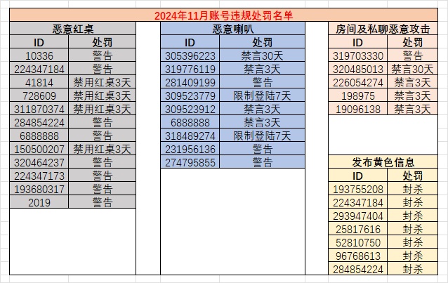 中游运营团队将定期对游戏内账号进行排查,对部分账号存在的违规行为,将进行严格处理;对多次违规的账号会不断加大惩罚力度(最高永久封禁)。