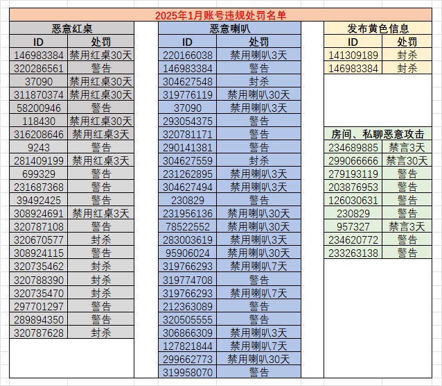 中游运营团队将定期对游戏内账号进行排查,对部分账号存在的违规行为,将进行严格处理;对多次违规的账号会不断加大惩罚力度(最高永久封禁)。