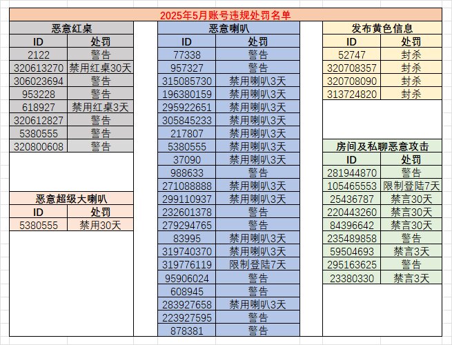 中游运营团队将定期对游戏内账号进行排查,对部分账号存在的违规行为,将进行严格处理;对多次违规的账号会不断加大惩罚力度(最高永久封禁)。